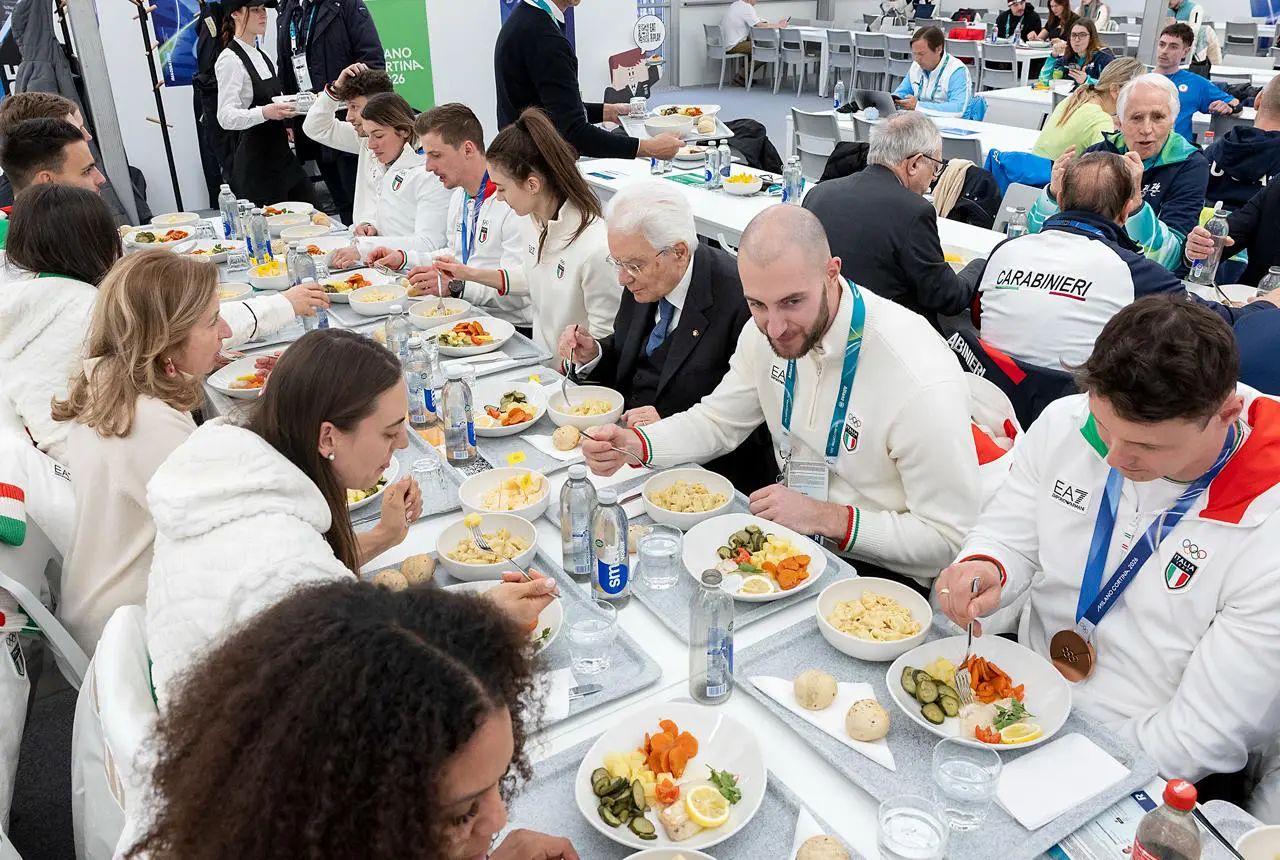 CORTINA (ITALPRESS) – Dopo aver assistito alla vittoria dell’oro di Federica Brignone, il Presidente della Repubblica Sergio Mattarella è a pranzo con gli atleti al villaggio olimpico di Cortina. Mattarella ha pranzato seduto in mezzo a Stefania Constantini e Amos Mosaner, vincitori del bronzo nel doppio misto di curling. Di fronte al presidente la figlia Laura. Il Capo dello Stato ha anche firmato il murale della tregua.